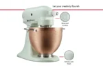 The 4.7L Artisan Tilt-Head Stand Mixer KSM180 features a soft thyme green colour with botanical accents, inspired by the aromatic herbs and edible flowers used in cooking and baking. The hammered copper bowl develops a unique patina over time, reflecting your growth as a maker.