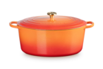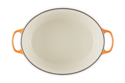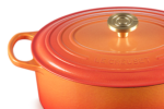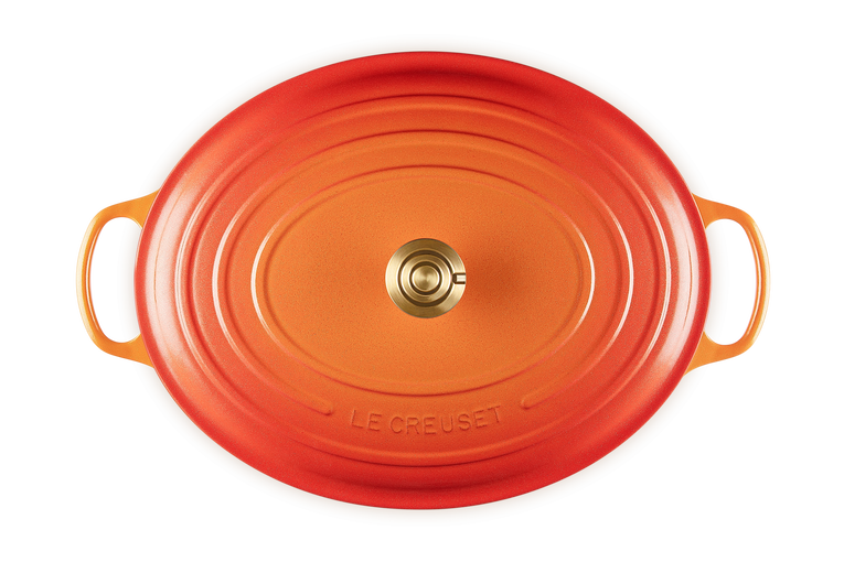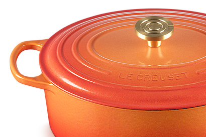 Expertly crafted from enamelled Cast Iron, the Signature Oval Casserole is ideal for various cooking styles. The elongated shape suits larger cuts of meat and whole roasts. As part of the limited-edition Flamme Dorée collection, it boasts a fresh sheen and a light gold stainless steel Crucible knob.