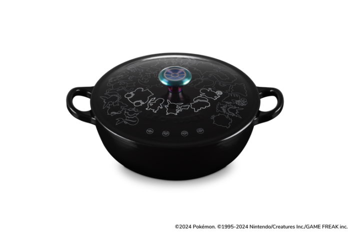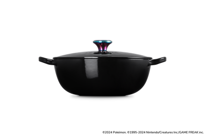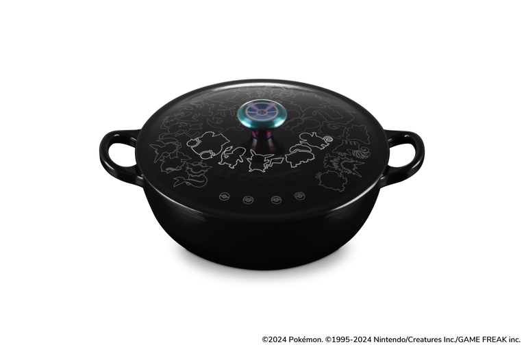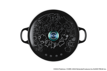 Finished in Shiny Black, this Marmite is topped with a lid featuring line art of 23 different Pokémon and four types of Poké Balls, along with an Iridescent Knob that gleams with rainbow colours. The rounded shape of this Enameled Cast Iron pot makes it easy to stir ingredients, rendering it ideal for cooking soups, stews, risottos, and other dishes.